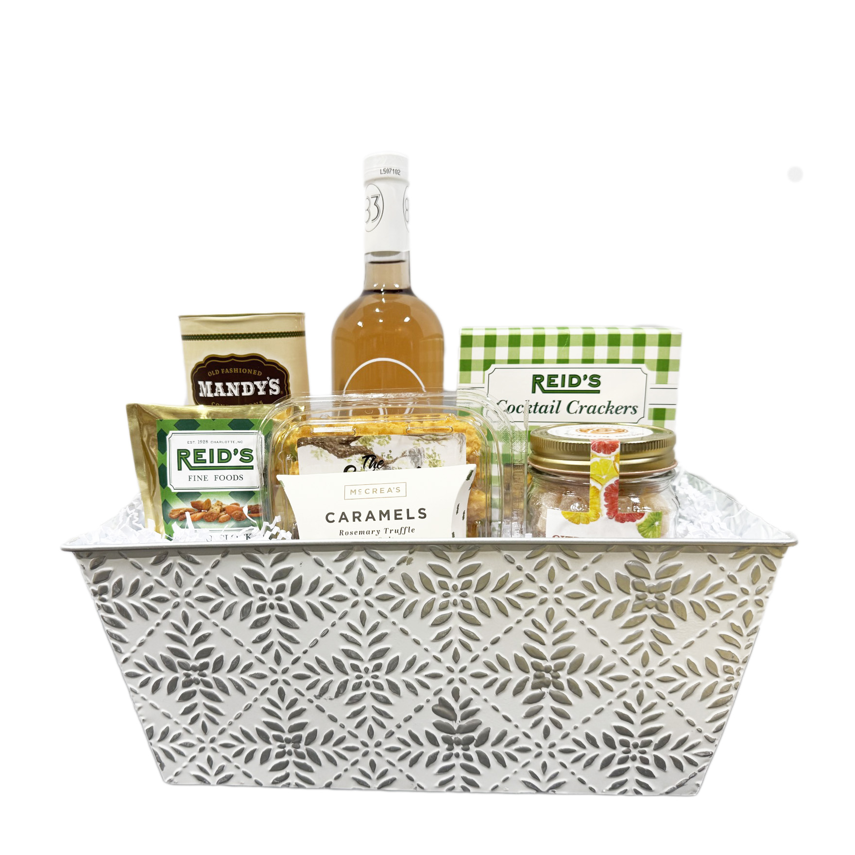 Mandy's Lemon Cookie Thins, Reid's Famous Original Cocktail Crackers, Reid's Five O'clock Crunch, Savannah Cheese Straws, McCrea's Rosemary Truffle Sea Salt Caramels, Butterfield's Citrus Candy Buds, and a 83 French Rosé